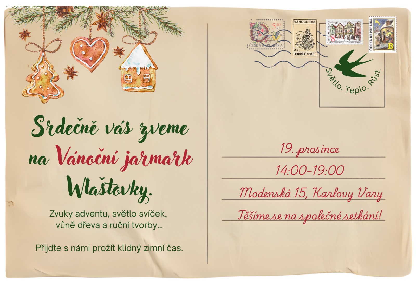 Přijměte srdečné pozvání na adventní setkání, VÁNOČNÍ JARMARK, který se koná v pátek 19. prosince od 14 do 19 hodin.